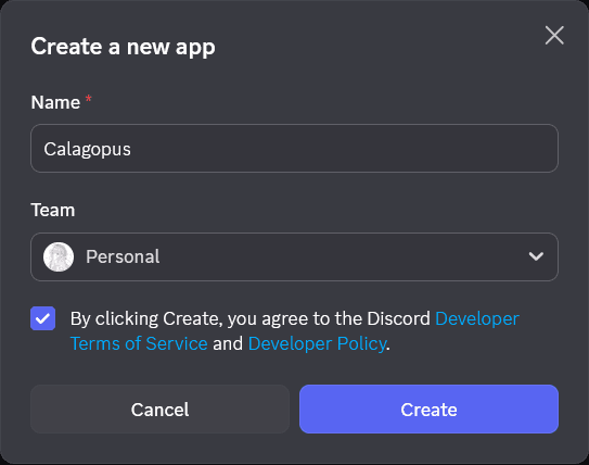 In the popup, type the name of your application, which will be shown on the Discord login page. Select a team if you have one and then click on Create.