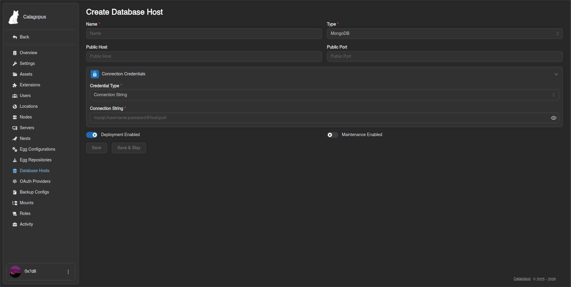 mongodb://calagopus:<strong-password>@<host>:27017/?authSource=adminReplace <strong-password> with the password you set and <host> with the IP address or hostname of the database server.
